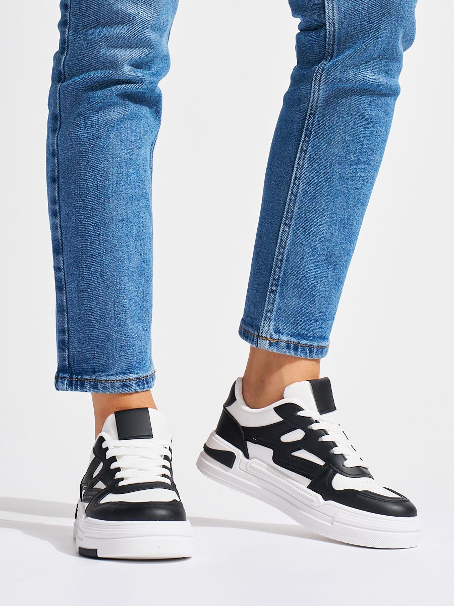 Entdecken Sie die stilvollen schwarz-weißen Plateausneaker, die die perfekte Wahl für den Alltag sind. Mit einer geschlossenen Zehenpartie und einem weichen, geschlossenen Fersenbereich sind diese Sneakers nicht nur bequem, sondern auch sehr trendy. Dank der Schnürung können Sie sie genau nach Ihren Bedürfnissen anpassen. Mit einer Plateauhöhe von 3 cm und aus ökologischem Leder gefertigt, sind diese Sneakers eine großartige Kombination aus Qualität und Stil. Das Innenfutter aus Textil sorgt für maximalen Komfort, während die Gummisohle mit Profil den nötigen Halt bietet. Perfekt für Herbst, Frühling und Sommer, sind diese Sneakers die ideale Wahl für jede moderne Frau, die nach praktischer und stilvoller Kleidung sucht.