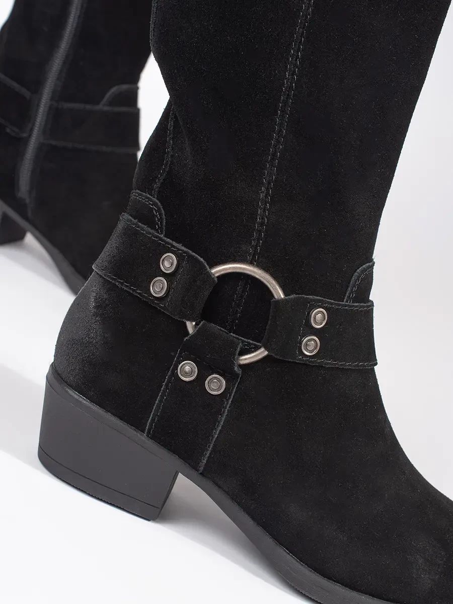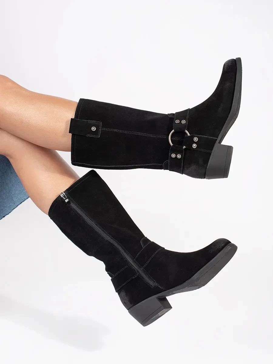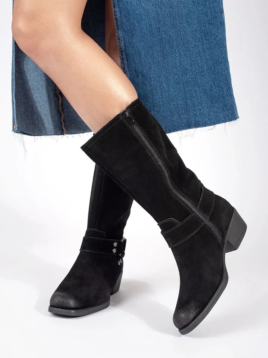 Entdecken Sie die perfekte Kombination aus Stil und Komfort mit den schwarzen Leder-Cowboy-Stiefeln von Sergio Leone. Diese eleganten Stiefeletten sind aus hochwertigem 100% natürlichem Nubukleder gefertigt, das nicht nur Langlebigkeit, sondern auch ein einzigartiges Aussehen garantiert. Mit einer runden Zehenpartie und einem integrierten Reißverschluss sind sie ideal für den täglichen Gebrauch, während der 4 cm hohe Absatz den nötigen Komfort bietet. Die Stiefel sind gefüttert, was sie perfekt für kühlere Herbst- und Wintertage macht. Dank des praktischen Reißverschlusses lassen sie sich leicht an- und ausziehen. Die Breite und Höhe des Schaftes (35 cm und 28 cm) sorgt für angenehmes Tragen, während die glatte Kunststoffsohle Stabilität verleiht. Diese Stiefel sind eine großartige Wahl für jeden Anlass, egal ob Sie einen Stadtbummel machen oder sich mit Freunden treffen.