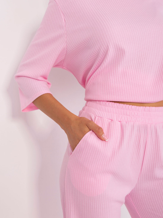 Wir präsentieren Ihnen ein hellrosa Damen-Casual-Set, das ideal für den täglichen Gebrauch ist. Dieses elegante Set besteht aus einer bequemen Bluse mit 3/4-Ärmeln und weiten Hosen, die so gestaltet sind, dass sie maximalen Komfort und einen stilvollen Look bieten. Das glatte Muster und der hohe Bund der Hosen verleihen diesem Outfit einen modernen Touch, während der gestreifte Stoff und die seitlichen Taschen Praktikabilität garantieren. Das Set besteht aus einer hochwertigen Mischung aus 65% Baumwolle und 35% Elasthan, was ein angenehmes Gefühl auf der Haut und Flexibilität beim Tragen gewährleistet. Dieses Outfit ist eine großartige Wahl für Stadtspaziergänge oder Sommertage. Vergessen Sie nicht, auch die Größentabelle zu überprüfen, um die richtige Größe für sich auszuwählen!